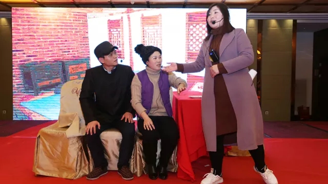 一句“下蛋公雞,公雞中的戰斗機”,引得大家哄堂大笑。圍繞著(zhù)這只神奇的公雞所展開(kāi)的緊湊劇情,讓大家忘了桌上的美酒佳肴,沉浸在了演者們賣(mài)力的表演之中。